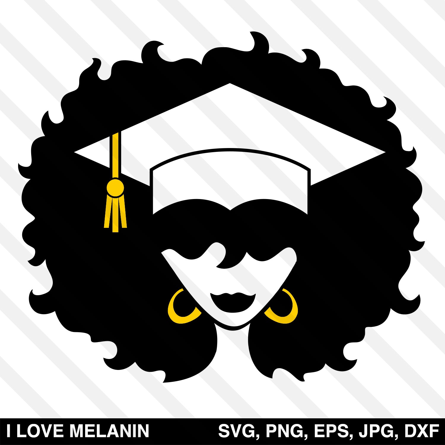 Graduation Black Woman digital vector files featuring African American woman with afro wearing a grad cap and gown in SVG, PNG, EPS, DXF and JPG format.