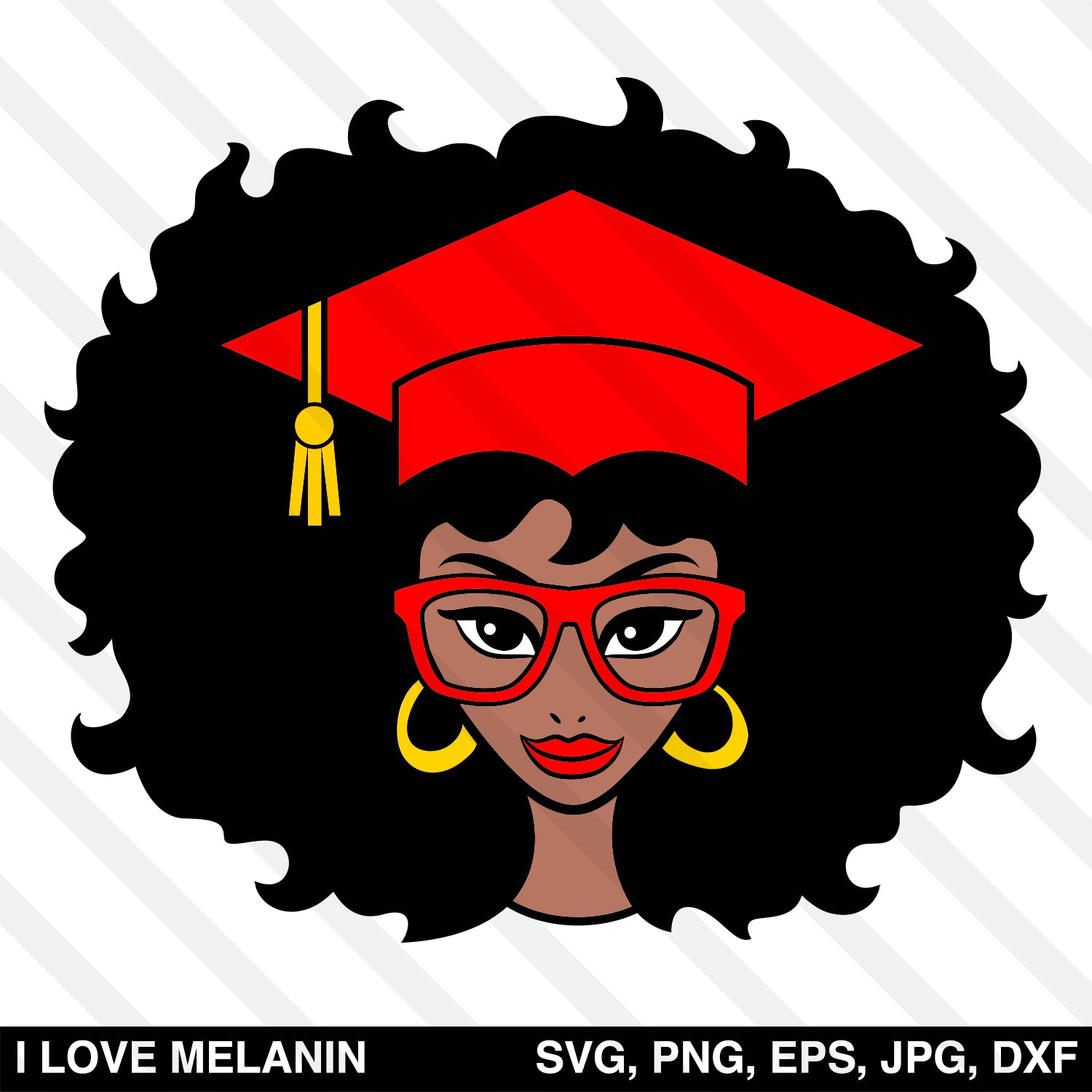 Graduation Black Woman digital vector files featuring African American woman with afro wearing a grad cap and gown in SVG, PNG, EPS, DXF and JPG format.